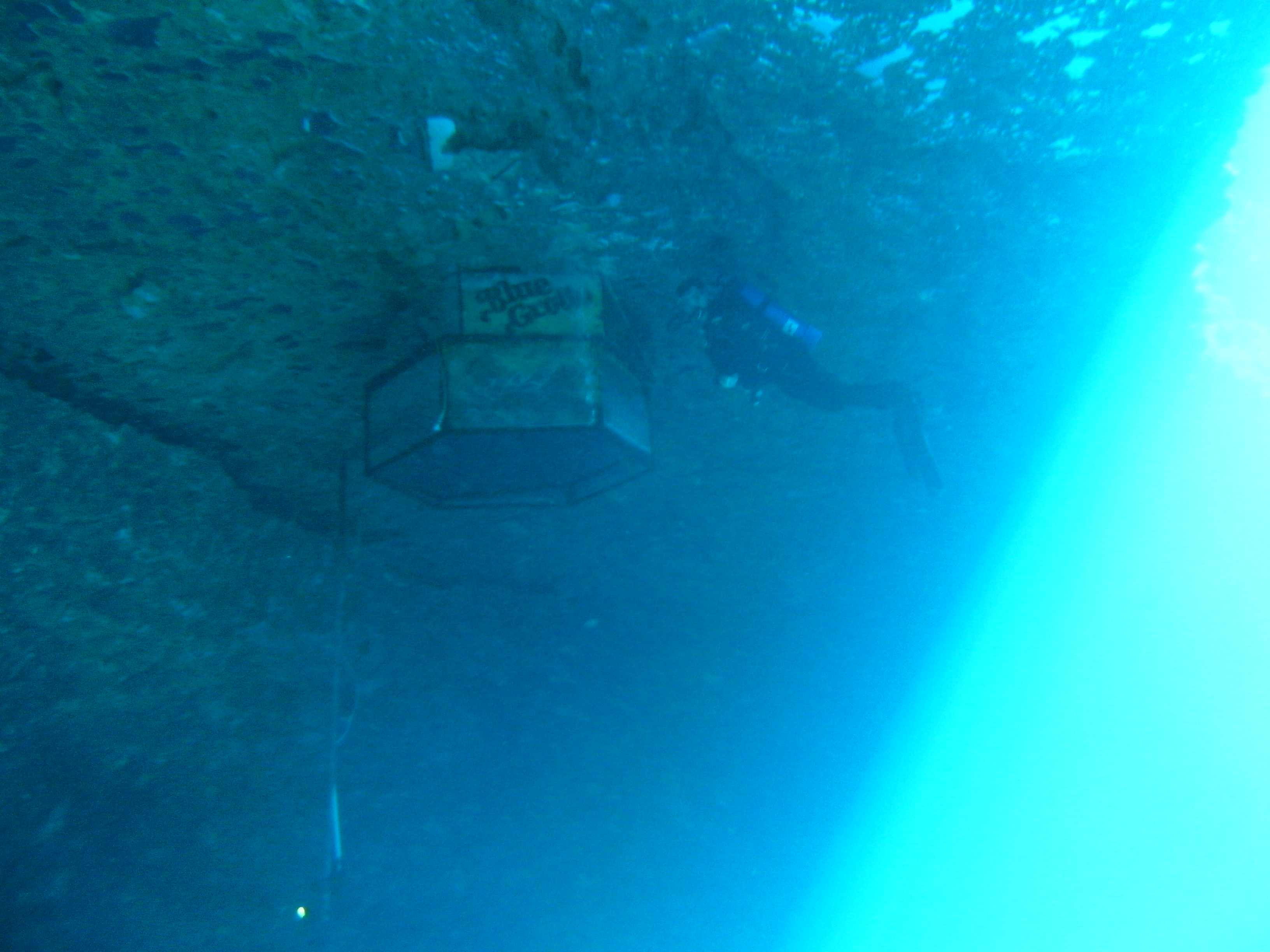 Here's another picture of Mark just outside the air bell. Note the mercury-like pockets of air stuck to the ceiling, a very common sight in the overhead environments frequented by scuba divers.