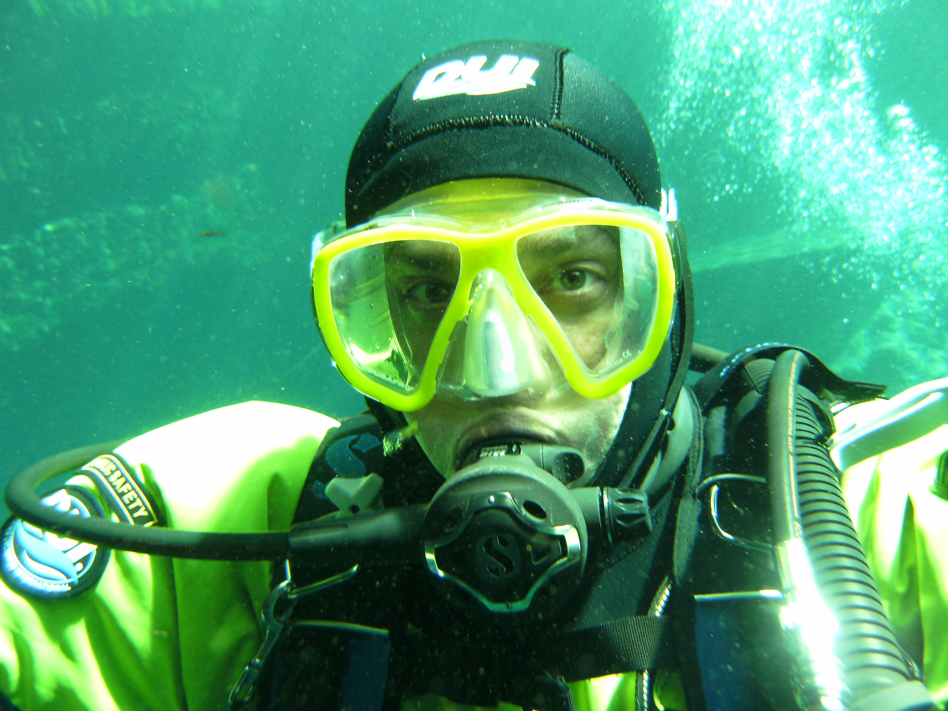 Here's another picture of Mark just outside the air bell. Note the mercury-like pockets of air stuck to the ceiling, a very common sight in the overhead environments frequented by scuba divers.